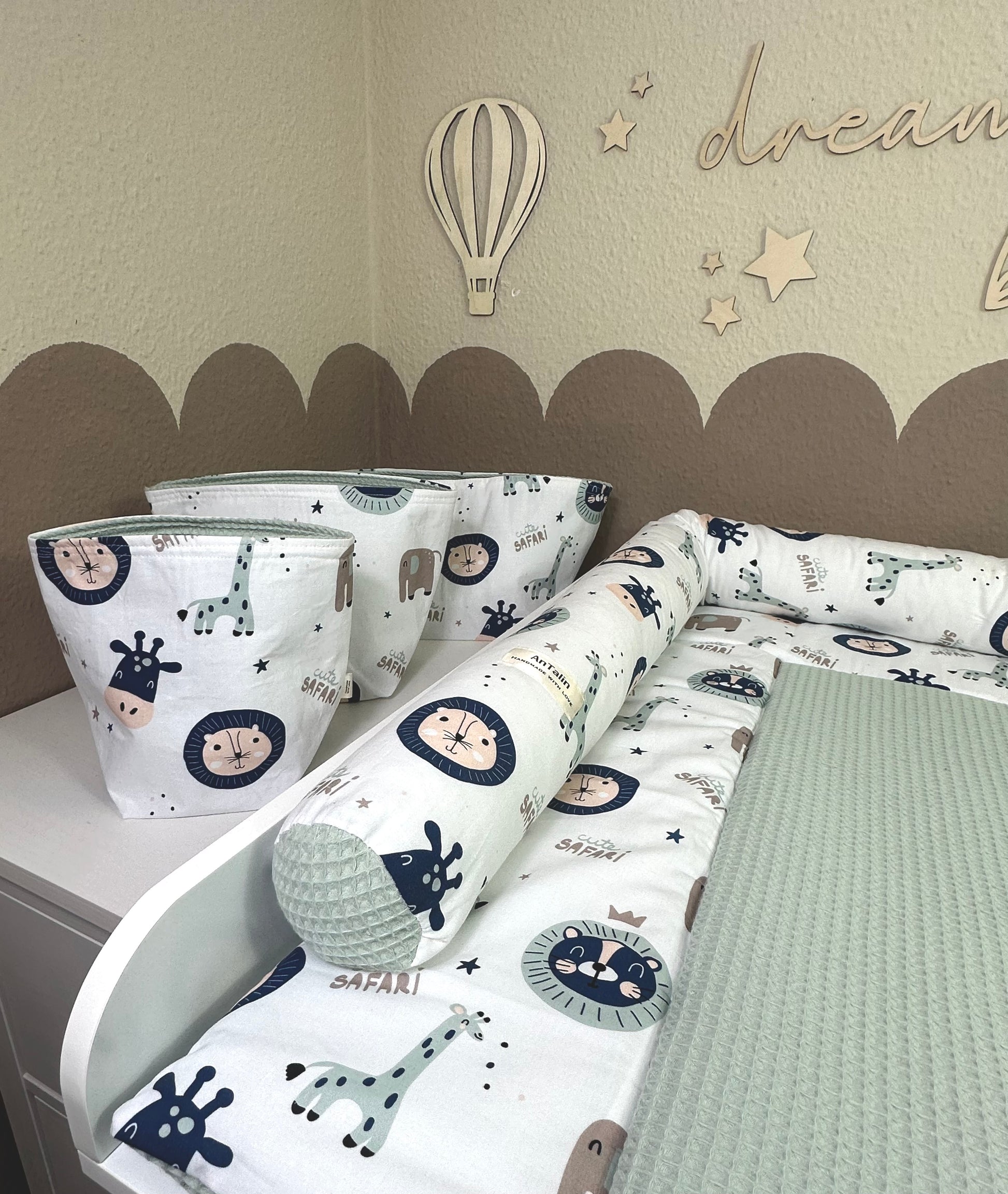 Wickelauflage 75×75cm, Utensilo Körbchen in S,M&L sowie das Dekokissen lang, welches das Gesamtbild nochmal verschönert und zudem auch noch Sicherheit bietet.