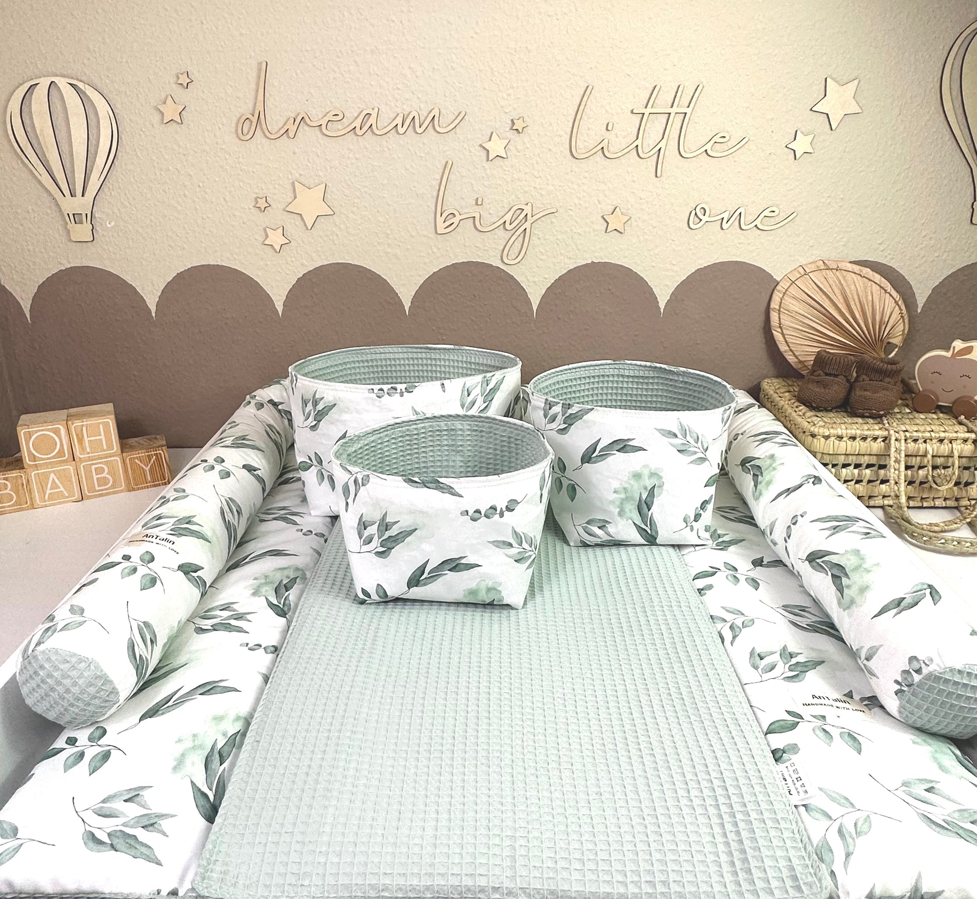 Wickelauflage, Utensilo Körbchen in S,M&L sowie das Dekokissen lang, welches das Gesamtbild nochmal verschönert und zudem auch noch Sicherheit bietet.