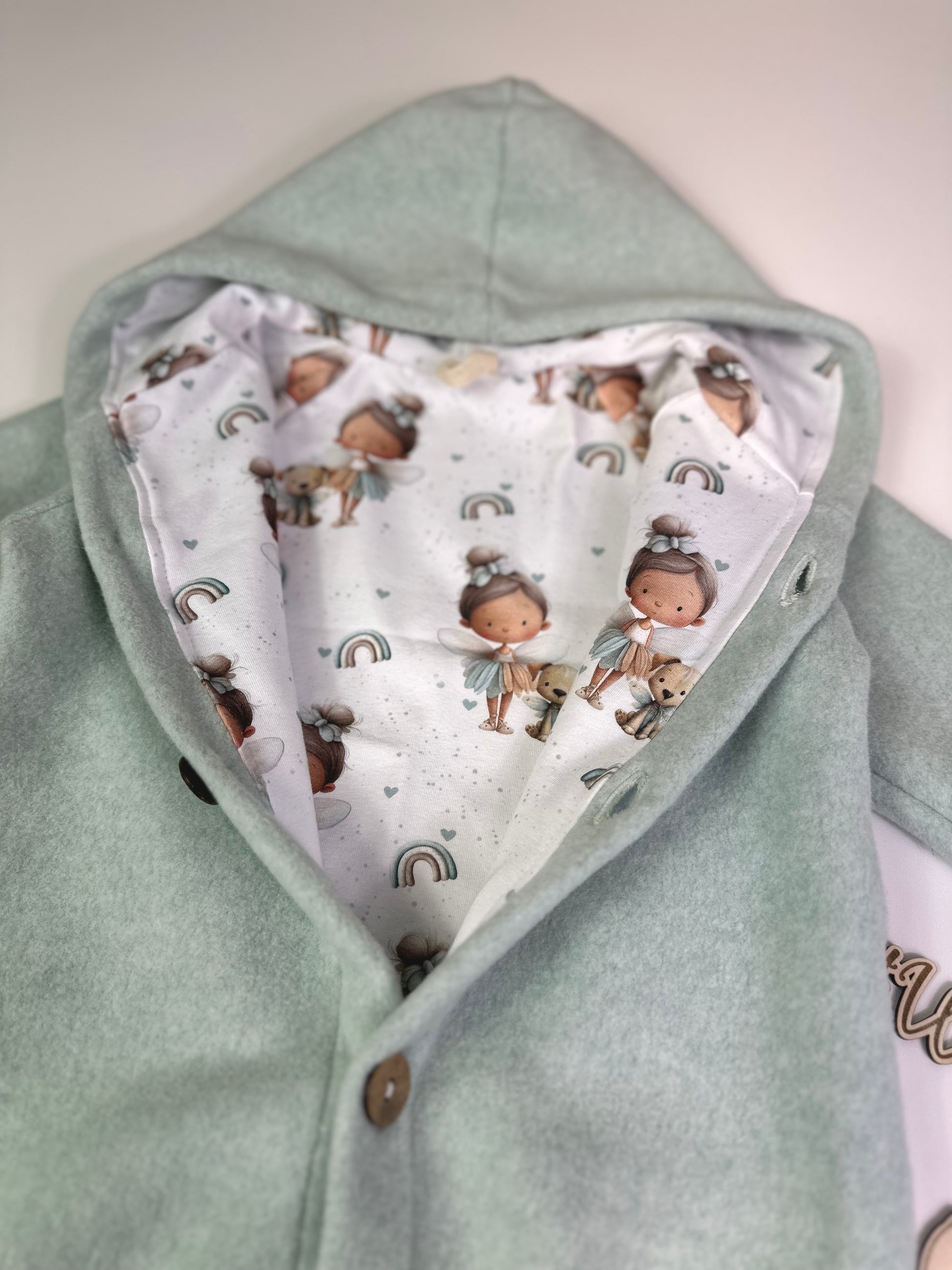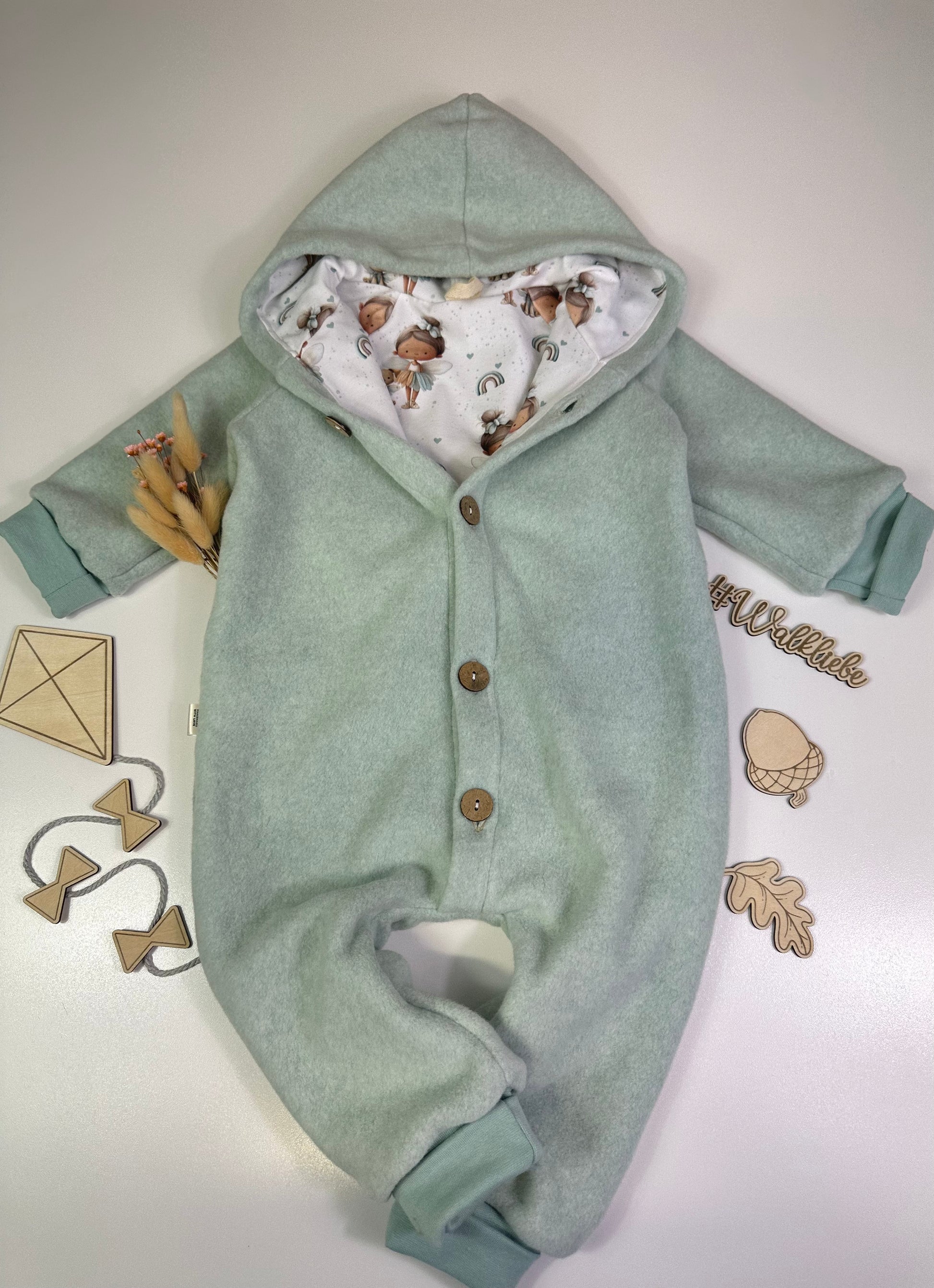 Unser liebevoll handgefertigte Baby Overall aus Walk ist der perfekte Begleiter für kühle Herbst- und Wintertage. Der weiche Walk sorgt für wohlige Wärme, während das Innenfutter mit süßen Elfen Design für ein Hauch von Eleganz und Komfort sorgt.