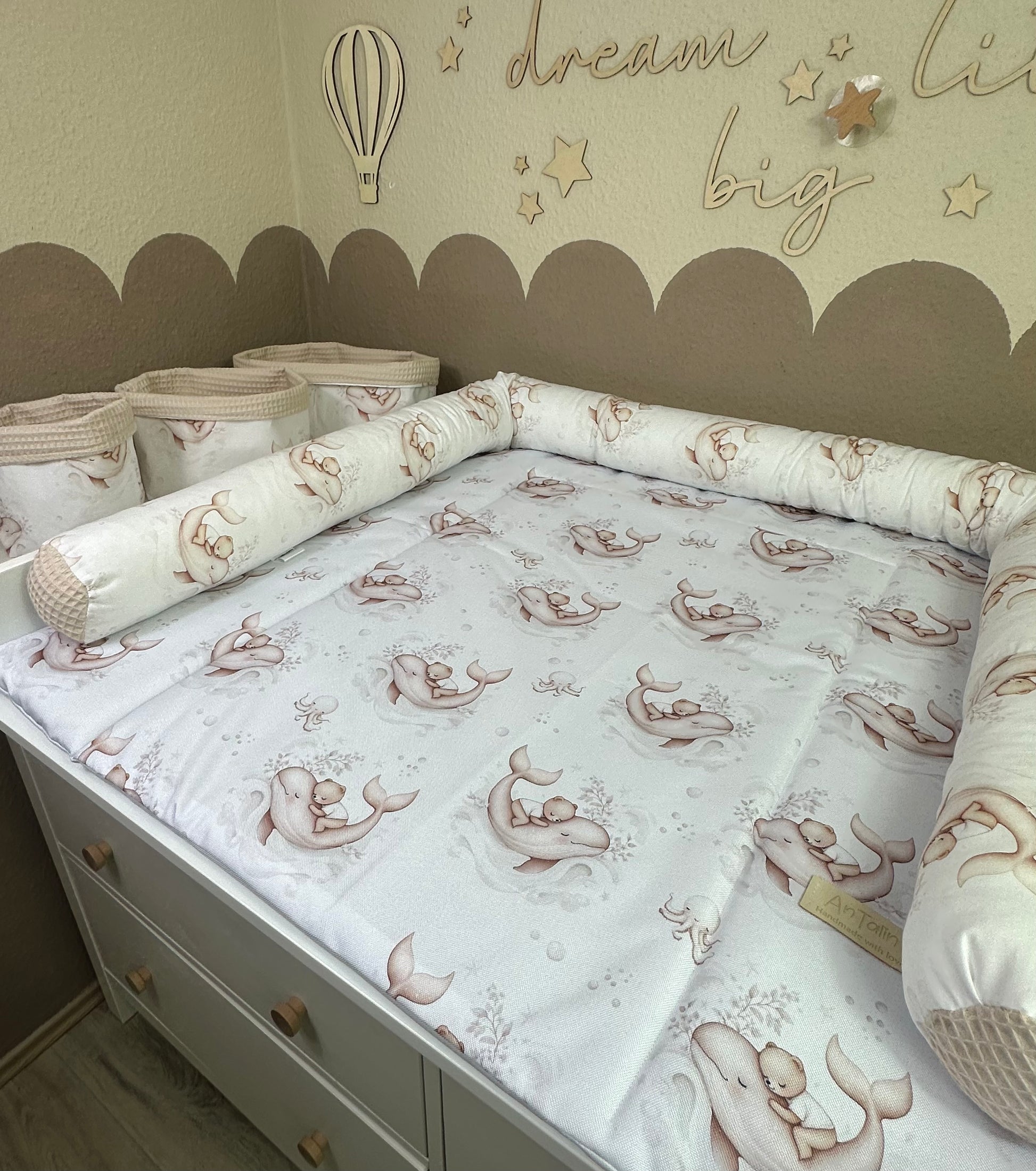 Die Wickelauflagen sind mit einem ca 4 cm dicken Volumenflies gefüttert. Das Mittelteil ist für einen besseren Halt abgesteppt.