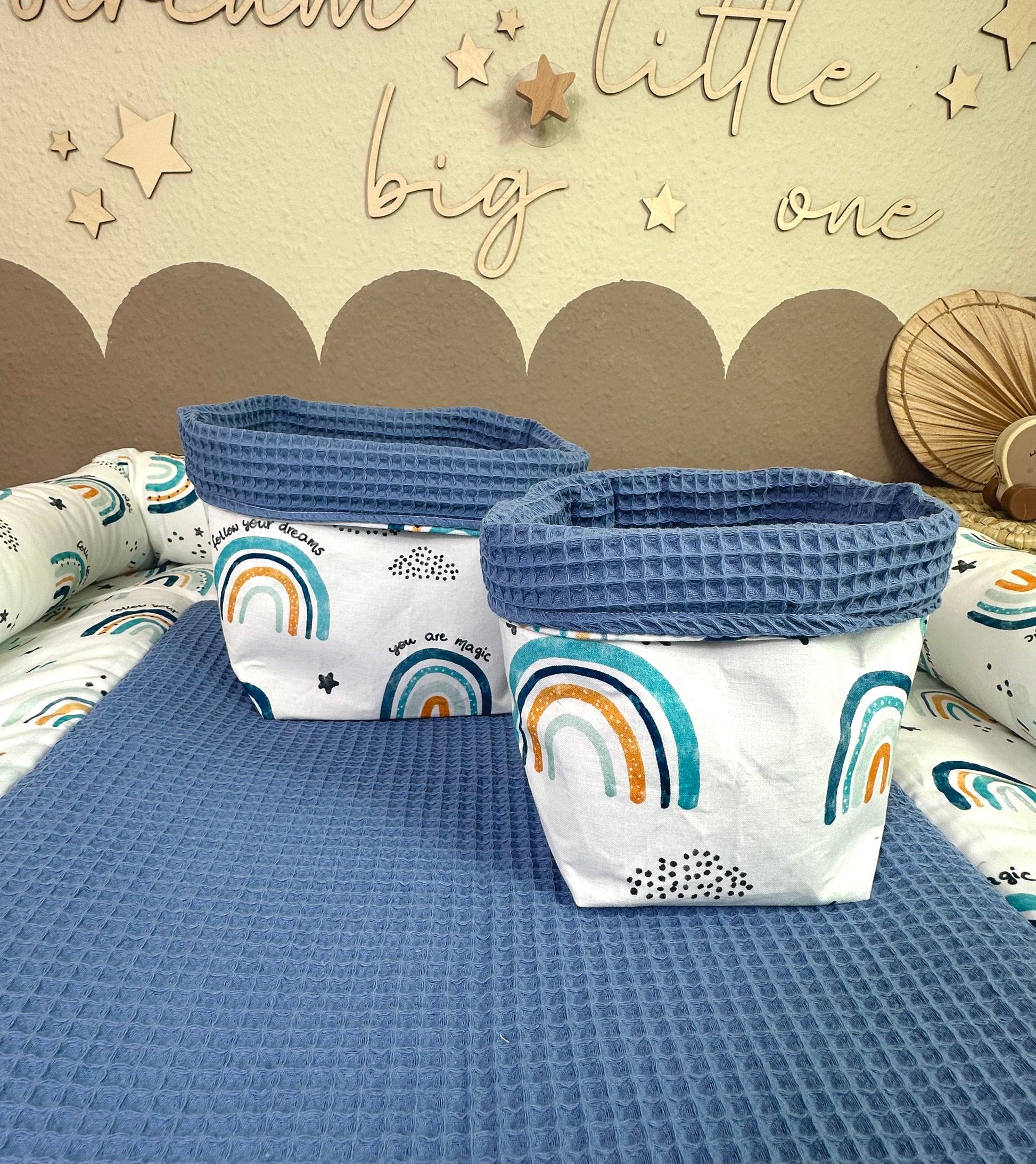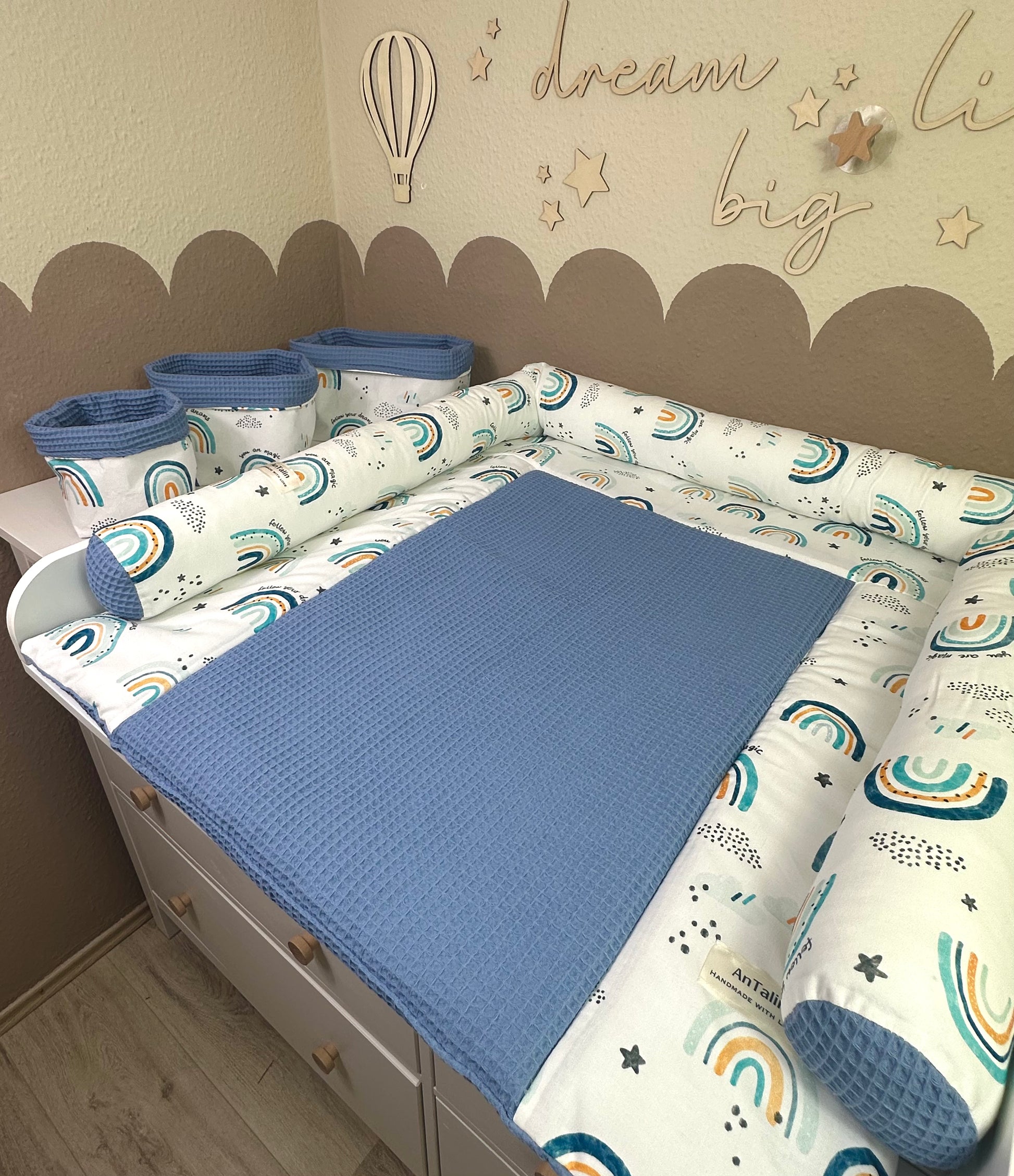 Wickelauflagen Set 5tlg. Regenbogen blau/ Waffelpique jeansblau