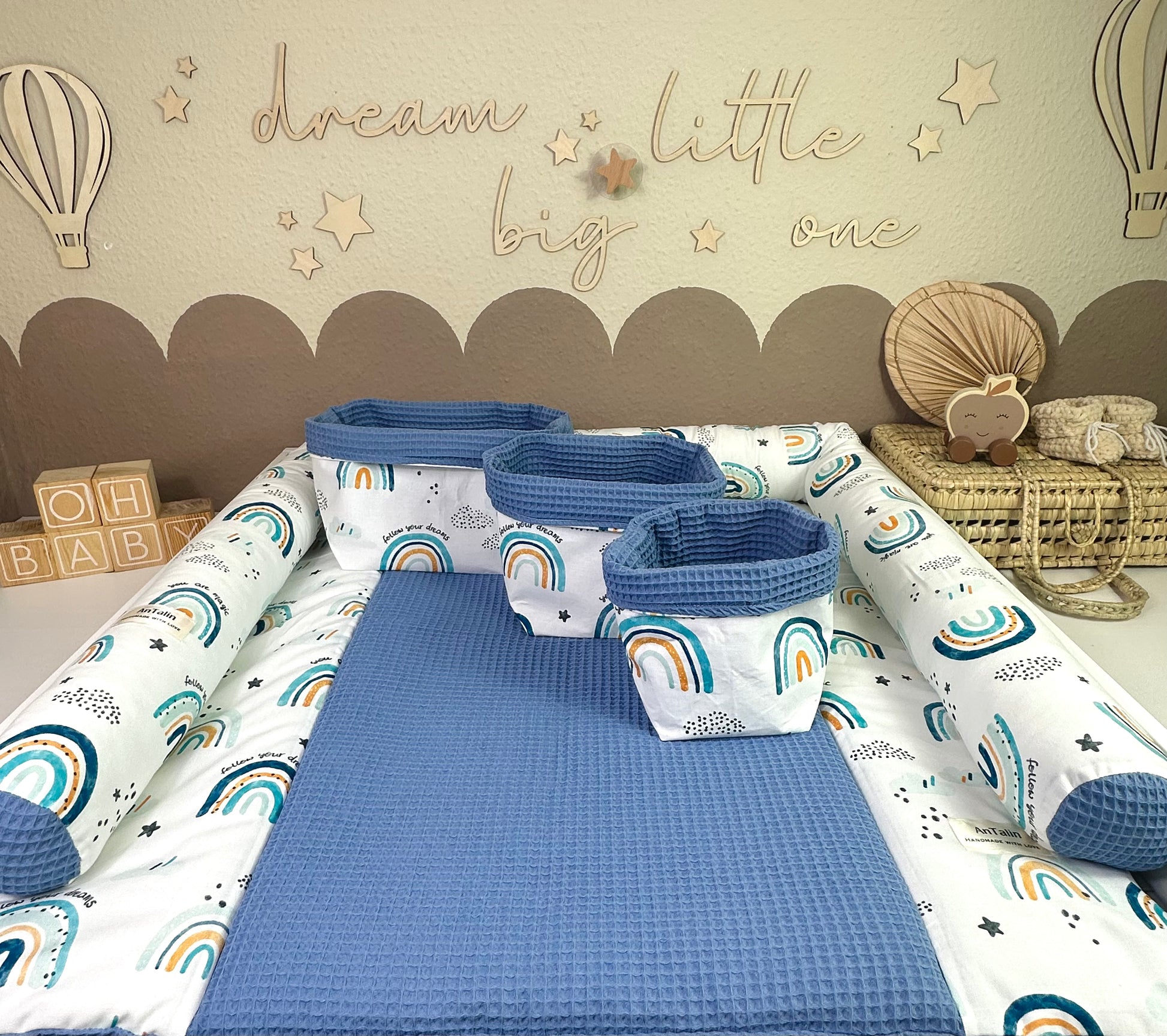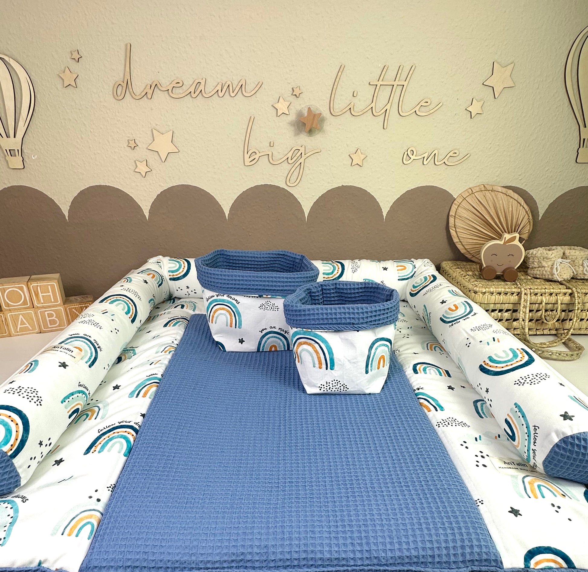 Wickelauflage passend für 75×75/77×77 cm, Utensilo Körbchen in S,M&L sowie das Dekokissen lang, welches das Gesamtbild nochmal verschönert und zudem auch noch Sicherheit bietet.